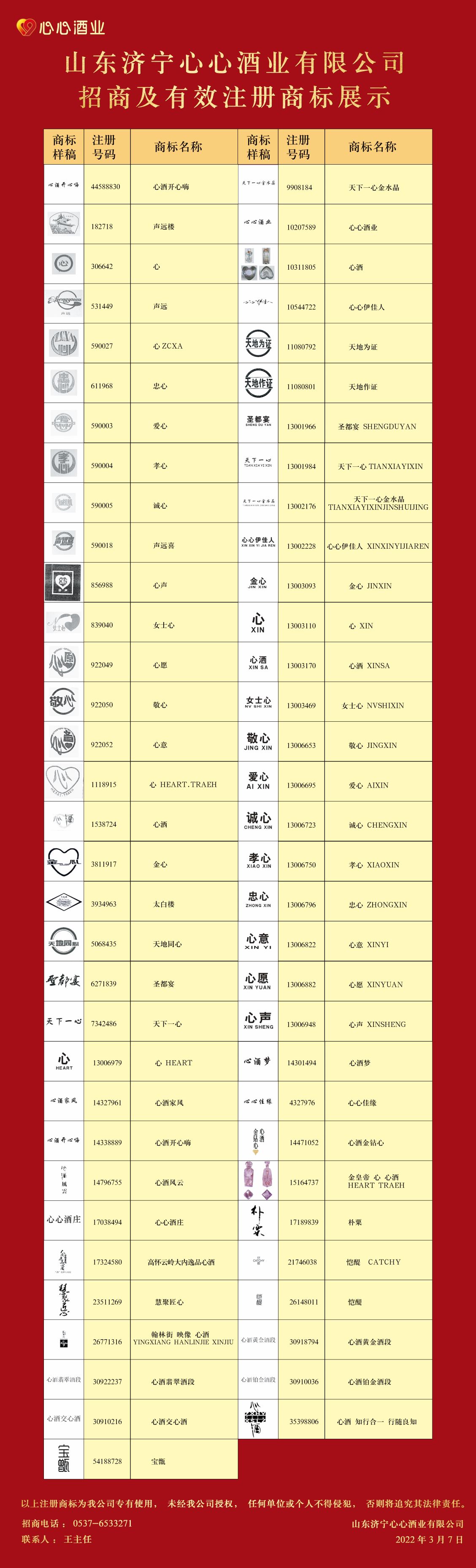 山東濟寧心心酒業有限公司招商及有效注冊商標展示