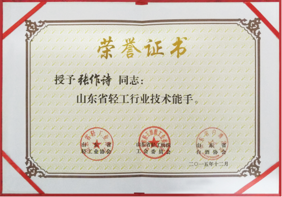 2015年12月18日-20日,山東省首屆“技能興魯”職業技能大賽暨山東省白酒首屆釀酒職業技能大賽隆重舉行。心心酒業有限公司糧食酒車間釀酒師張作詩參加比賽,被授予“山東省輕工行業技術能手”榮譽稱號。“這不是我個人榮譽,是企業榮譽,是各位領導對我的大力支持和企業對我的培養所取得的,所以,我要感謝廠領導給我這一個平臺。通過這次技能大賽所取得的經驗,要運用到生產實際中區,要抓好質量關,要提高員工的思想素質,要提高員工的技能水平,團結上下一致,建立一個技能團隊,為企業發展,再創佳績。”張作詩說道。
