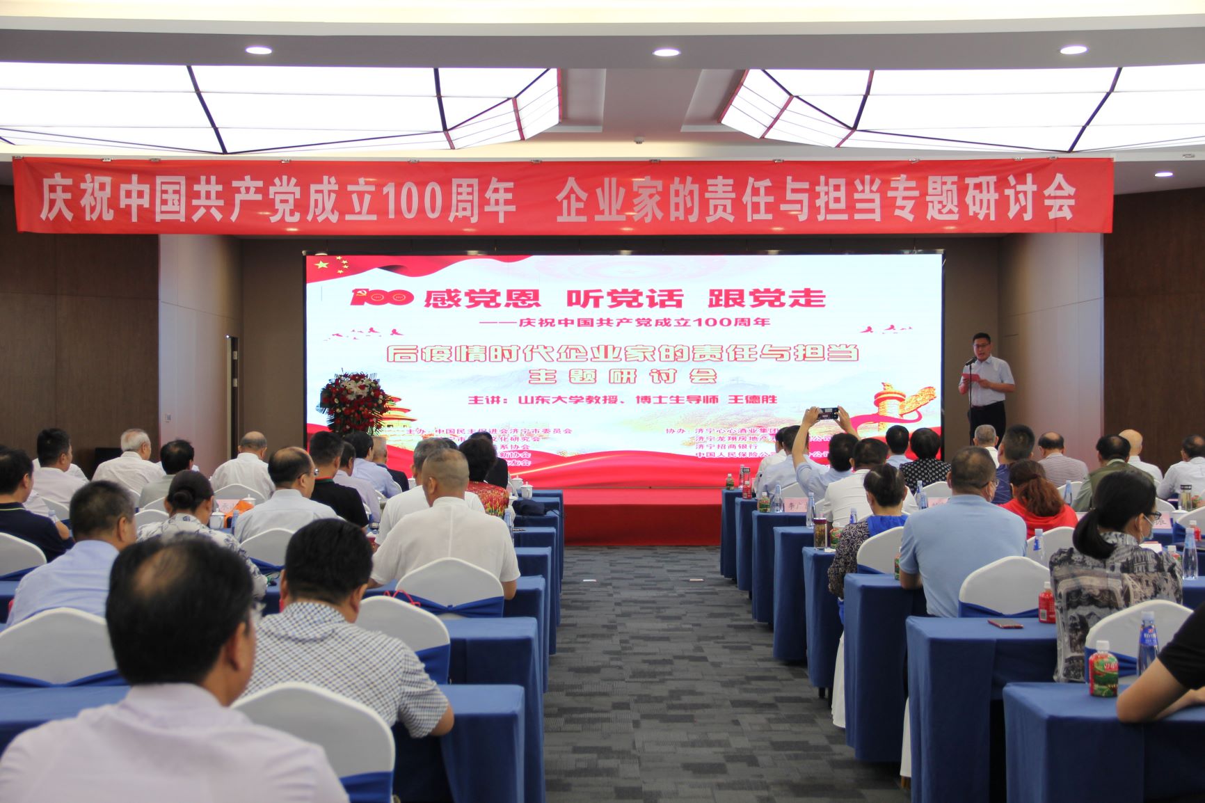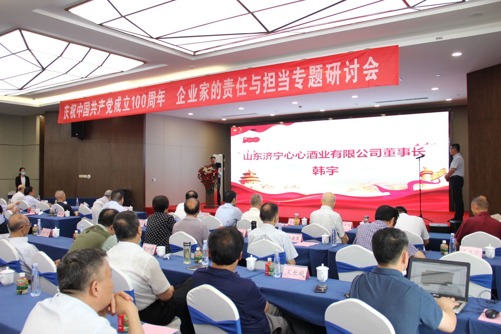 2021年6月26日上午,由中國民主促進會濟寧市委員會,濟寧市運河文化研究會,濟寧市國際國內公共關系協會,濟寧市學人創新協會,山東大學濟寧校友會聯合主辦,心心酒業協辦的“感黨恩、聽黨話、跟黨走——慶祝中國共產黨成立100周年 后疫情時代企業家的責任與擔當”專題研討會在濟寧黃淮賓館舉行,會議由山東濟寧心心酒業有限公司副總經理齊道勇主持。100多名行業協會負責人、企業代表匯聚一堂共議濟寧企業高質量發展的路徑與未來。